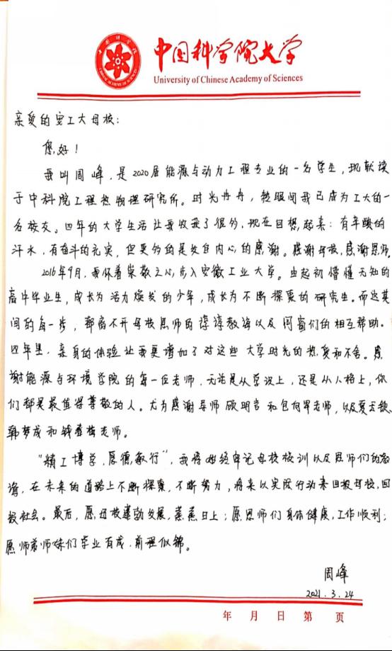 宝剑锋从磨砺出,2020年周峰保送至中科院工程热物理研究所攻读硕博研究生。他用行动展现了有梦就去追的可贵精神,为低年级学生树立刻苦勤奋、奋发向上的榜样典型。(附:周峰写给母校的信)