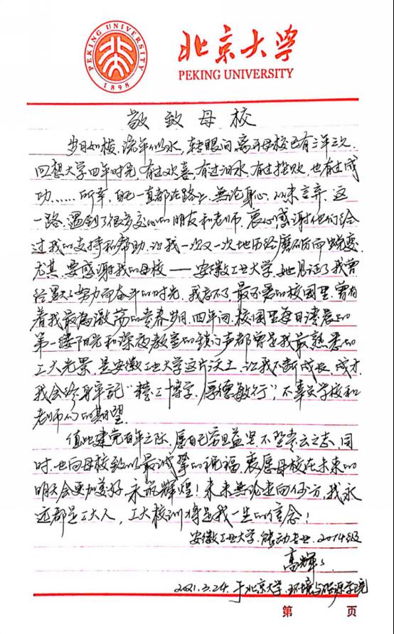 功夫不负有心人,2018年,高辉辉以年级第一名的优异成绩保送至北京大学攻读研究生,立志为国家节能减排事业作贡献。他表示,勤奋上进是他不变的信念,一如既往的努力和付出是其致胜的法宝,在接下来的路途中一定会继续发奋图强。(附:高辉辉写给母校的信)