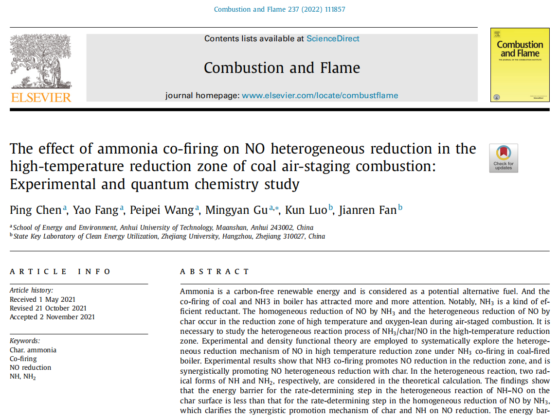 近日,1946伟德国际源自英国青年教师陈萍在燃烧领域国际权威期刊《Combustion and Flame》上,以第一作者身份发表了题为“The effect of ammonia co-firing on NO heterogeneous reduction in the high-temperature reduction zone of coal air-staging combustion: Experimental and quantum chemistry study”的论文。该论文通讯作者为1946伟德国际源自英国顾明言教授,合作者为浙江大学能源工程学院樊建人教授和罗坤教授。伟德国际victor1946为第一单位,研究工作得到国家重点研发计划项目(2017YFB0601805)的资助。