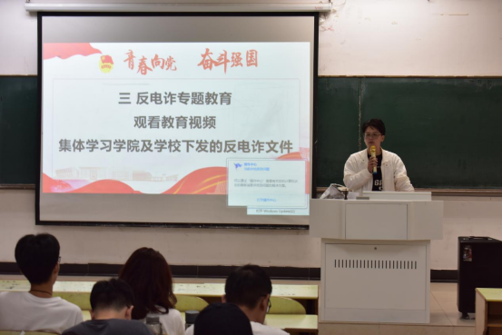 会议带领全体学生学习了学校及能环学院关于防范电信诈骗的相关文件,集体观看了防电诈宣传视频,通过真实案例深刻揭露了电信网络诈骗的常见套路及目标群体,特别是网络刷单、网贷、冒充客服退款、冒充公检法人员等电信诈骗形式,讲解了诈骗犯罪分子惯用作案手段、诈骗花式、常见手法及“识骗防骗”技巧,切实提高广大学生的防范意识和能力。