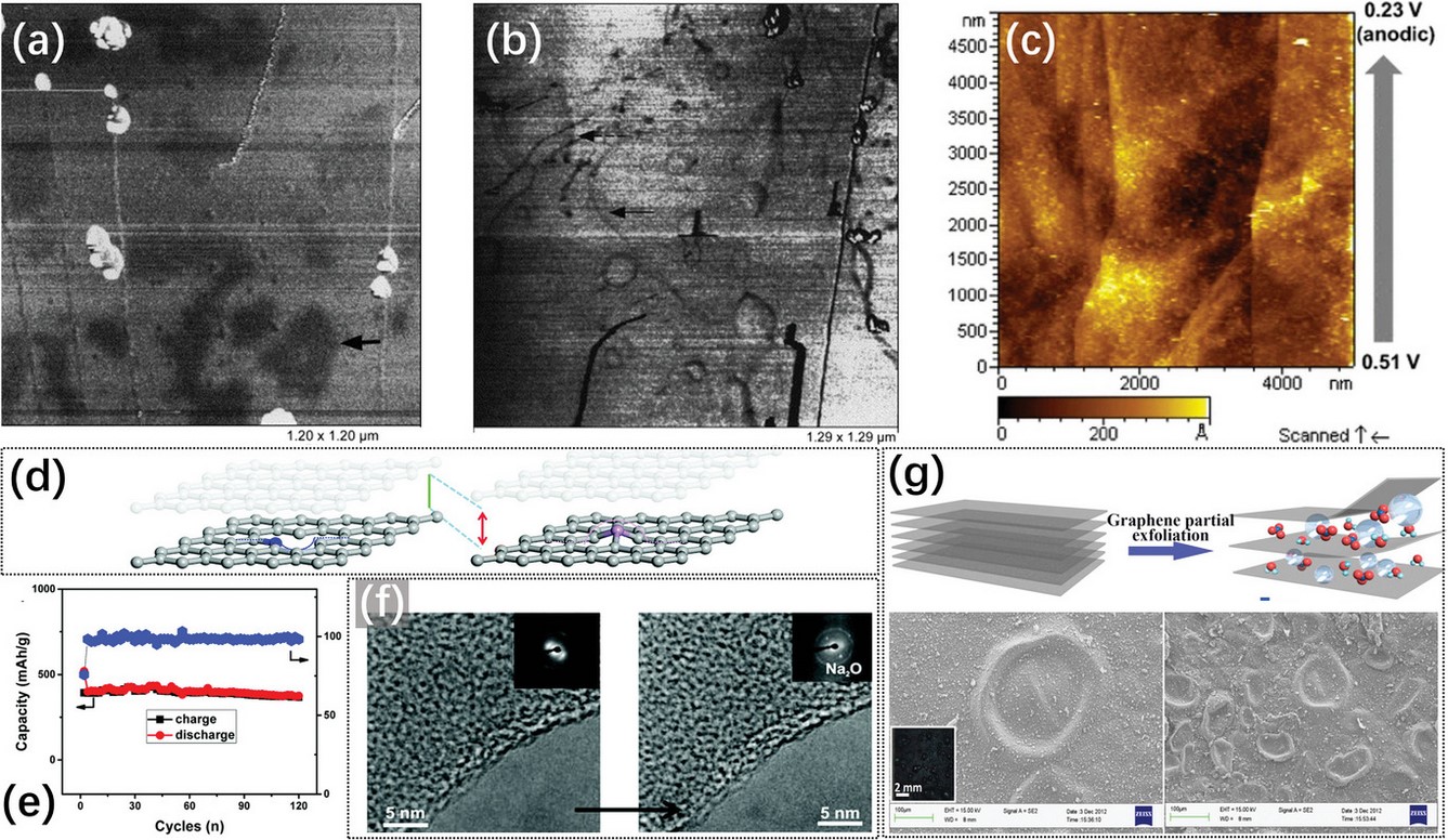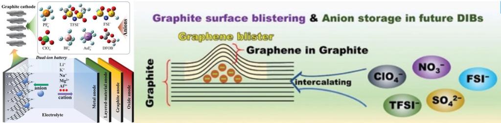 近年来,双离子电池作为一种新型储能器件受到广泛的关注,“石墨中的石墨烯(Graphene in Graphite)”一直存在于双离子电池的石墨阴极中。论文结合不同研究领域的结果,包括石墨氧化、石墨烯纳米力学、凝聚态物理、电润湿和双离子电池,综合加以说明阴离子嵌入和石墨烯泡在大块石墨中的形成;从石墨烯泡的弹性及其与石墨晶界的关系出发,讨论了石墨烯泡的可逆变形和阴离子存储能力,提出“石墨烯泡模型”。该模型的结论被用于解释双离子电池中的许多异常行为,揭示“石墨中的石墨烯(graphene in graphite)”对阴离子插层的重要性。可以预见,石墨烯泡壳内完整的晶格结构可以利用超高弹性刚度和可逆晶格膨胀,来提高电池中的阴离子存储容量。