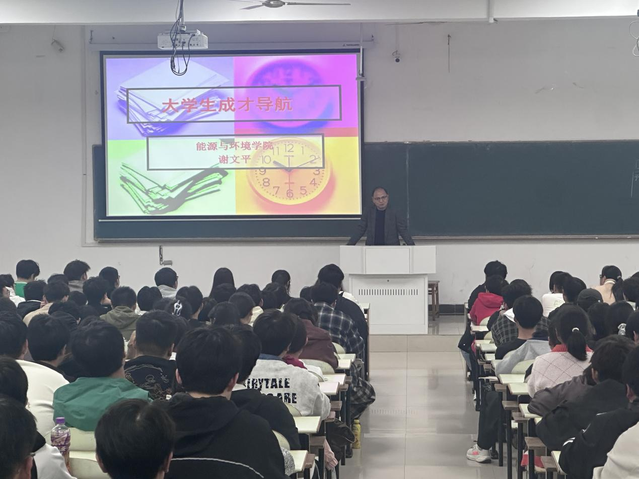 随后,谢文平系统梳理了从大一至大四各阶段可能面临的学习与生活问题,并提出针对性建议。他引用“鲶鱼效应”“塞翁失马,焉知非福”等生动案例,启发学生正确看待竞争、压力与挫折,培养积极心态与应变能力,在变化中把握成长机遇。