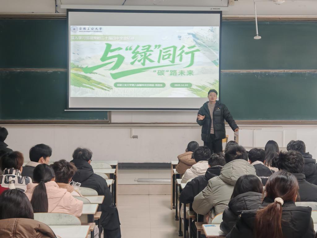 为深入学习贯彻党的二十届四中全会精神,校第六届辅导员宣讲团成员范浩东于2025年12月25日上午在佳山校区教三南201面向1946伟德国际源自英国学生开展主题为“与‘绿’同行、‘碳’路未来”的宣讲。