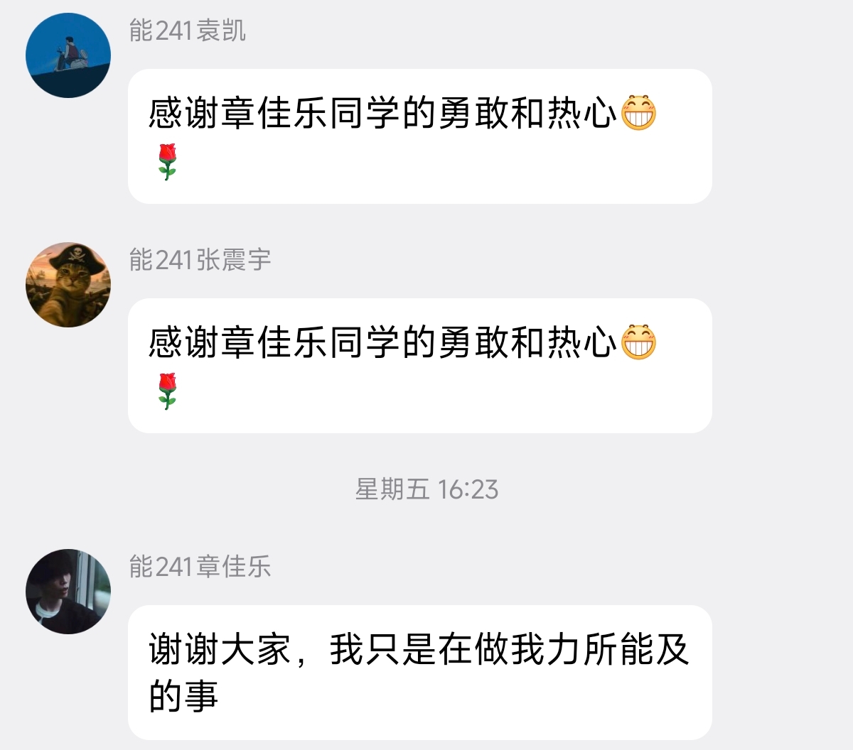 最后,与会领导老师和同学们为章佳乐同学送上鲜花和慰问品,并一起合影留念。镜头前,章佳乐的笑容温暖而坚定,那份“力所能及”背后的勇气与担当,深深感染了在场每一个人。这场简朴而隆重的欢送会,也是对全院青年学子的一次精神感召——愿更多能环人在他人需要时,勇敢伸出援手,让青春在奉献中闪闪发光。